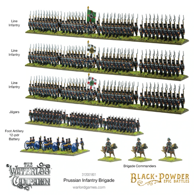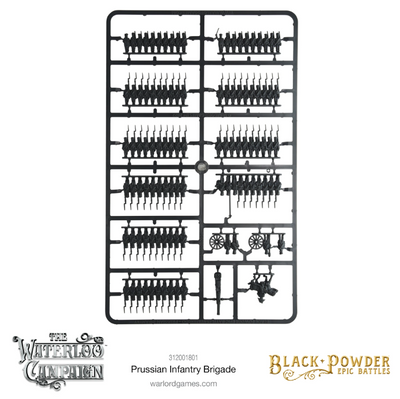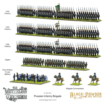 This plastic set provides enough models to field a complete brigade of three Prussian line or light infantry regiments of 80 men each, three bases of jägers, a 3-gun Foot Artillery 12-pdr battery and three mounted brigade commanders