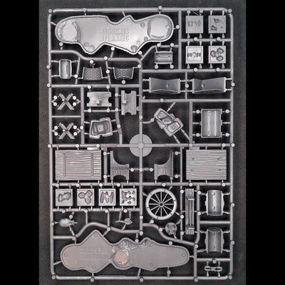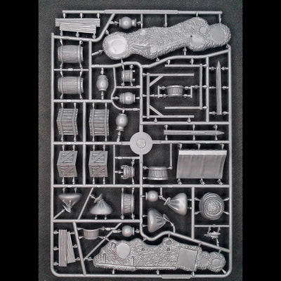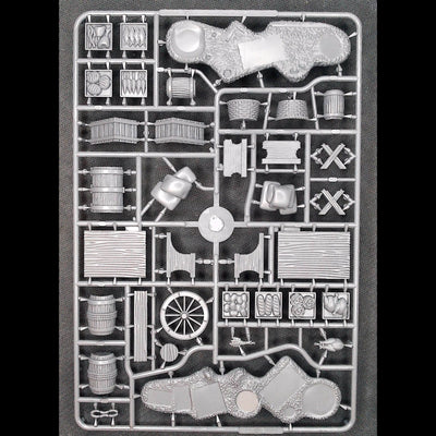 This hard plastic set features two unique frames that can be assembled to create 8 barricades. OR the same components (minus the barricade bases) can be built as a full marketplace including covered stalls, trestle tables, chairs, chests, buckets, baskets, barrels, sacks, pots, crates, and a variety of food stuffs!