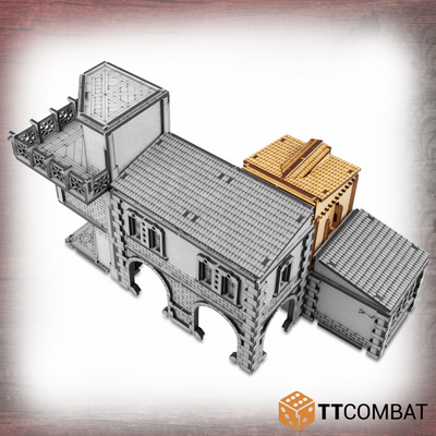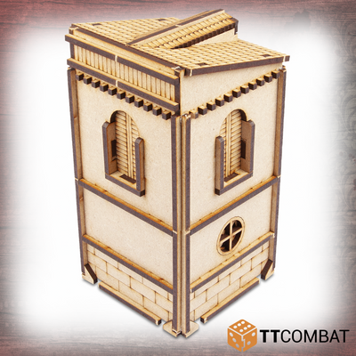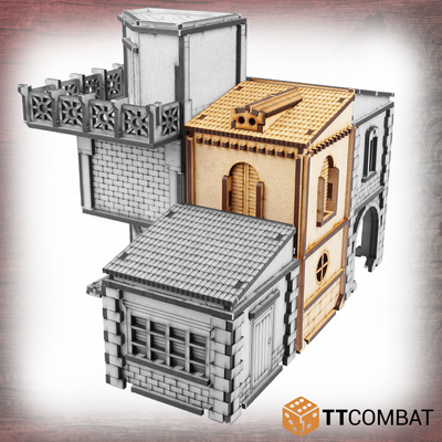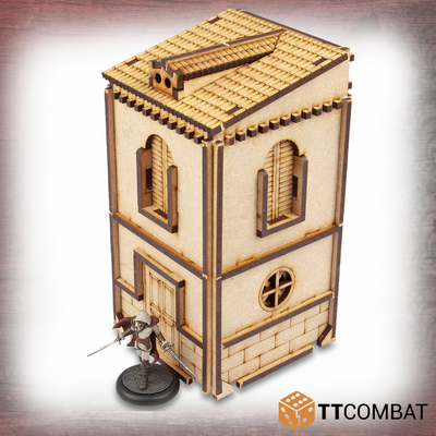 This kit is made from 3mm MDF and has been designed for Carnevale, using multiple storeys to climb and jump, and roofs at easy angles so that miniatures will not fall off when darting across the Venetian skyline. It is a great piece of scenery to use with other 28-32mm games.