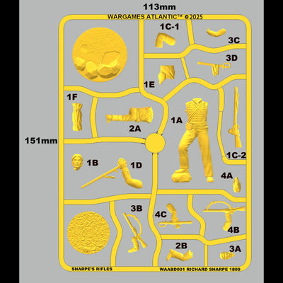 This hard plastic box set includes two complete multi-part figures. There is a 54mm display mono-pose version of Sharpe and a 28mm multi-part version that includes two head and arm options. There are scenic bases for each figure in the box.