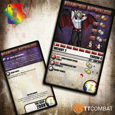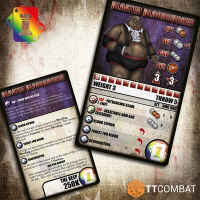 The Bloated Bloodsucker has let his thirst for blood get the better of him, though that has done nothing to quash his charming gaze. The Dhampir Daywalker doesn't have the sunniest of dispositions, not being a full Vampire, though that doesn't stop them from bleeding the opposition dry.