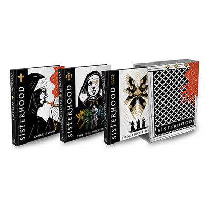 Stop the apocalypse with finality and in style with this limited edition Sisterhood collectors slip case. Contains the Core Rule Book and both major expansions in a sleek confessional box.