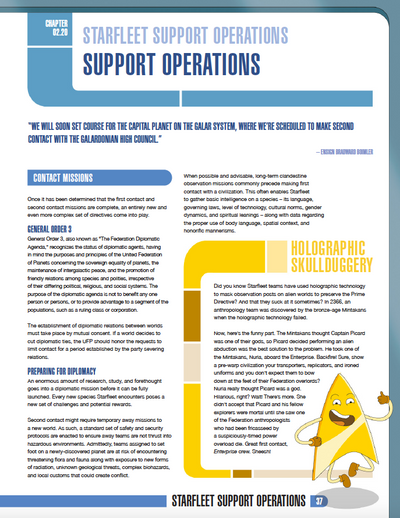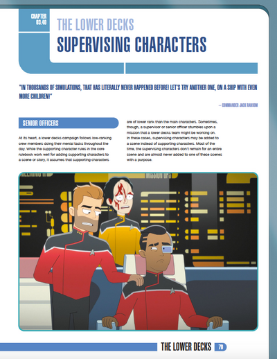 More than 50 non-player characters to include in your games, pulled from a variety of polities and species. A three-part mini-campaign focused on junior officers that can be adapted for use in other eras of play and with crews from any polity. Includes a foreword written by Star Trek: Lower Decks creator, Mike McMahan!