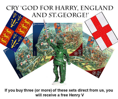 The figures in this box represent the English Army at the height of the Hundred Years War, when the English bowmen dominated the field of battle in France. Specifically the figures cover the period from the Battle of Agincourt (in 1415, when they were led by Henry V) to the Siege of Orleans (1429, when the French were led by Joan of Arc) which became the turning point of the war. All the Men at Arms are represented in the full plate harness which was now the norm for gentry, as with the metal range, they cover the first flowering of real full plate armour. This being mostly rounded and ‘globular’. Although they are described these as English they could be used as French too. The only differences being the English tending to fight in ‘white’ uncovered armour a little more more than the French. With armour styles the box covers the main types used during these 14 years. Things changed quite fast especially with the basinets at this time. More plates were being added to the basic basinet with aventail until the aventail disappeared altogether and you had the full great basinet. The houndskull visors also became globular during this period.