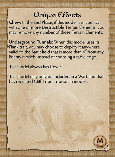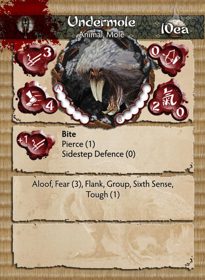 Most tribes have developed to the point of domesticating animals. The Tribes on the Great Plains use horses for travel and birds of prey for hunting. For the subterranean followers of the fallen gods, they have had little choice but to turn to the half-wild undermoles who dwell alongside them in the dark. They assist in digging escape tunnels and alerting the tribesfolk when danger is near. Unfortunately, they are also known to chew through nearly everything, including equipment, housing and defences.